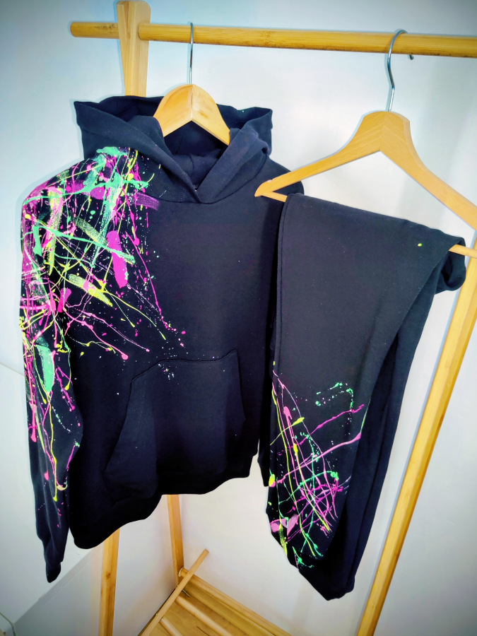 DÁMSKÁ MIKINA S KAPUCÍ A KLOKÁNKOVOU KAPSOU, RUČNĚ STŘÍKANÁ, ŠITÁ.